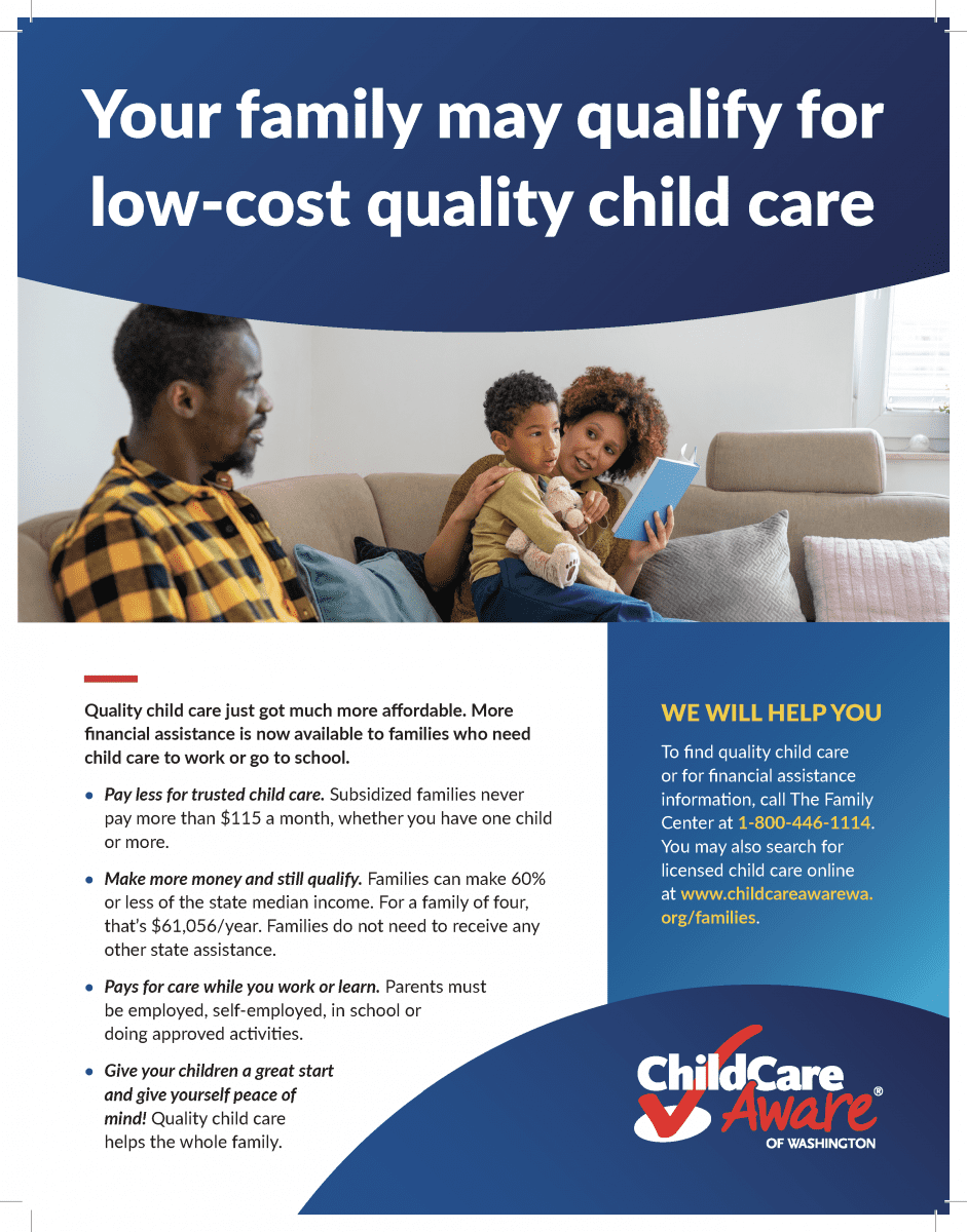 High-quality child care is expensive. Thanks to the hard work of many parents, child care providers, and community partners, last year the Washington State Legislature passed the Fair Start for Kids Act. The Fair Start for Kids greatly expanded access to affordable child care for families in Washington State. For more information or to find child care, contact our friends at the Child Care Aware Family Center at 1-800-446-1114 or visit www.childcareawarewa.org/families.
